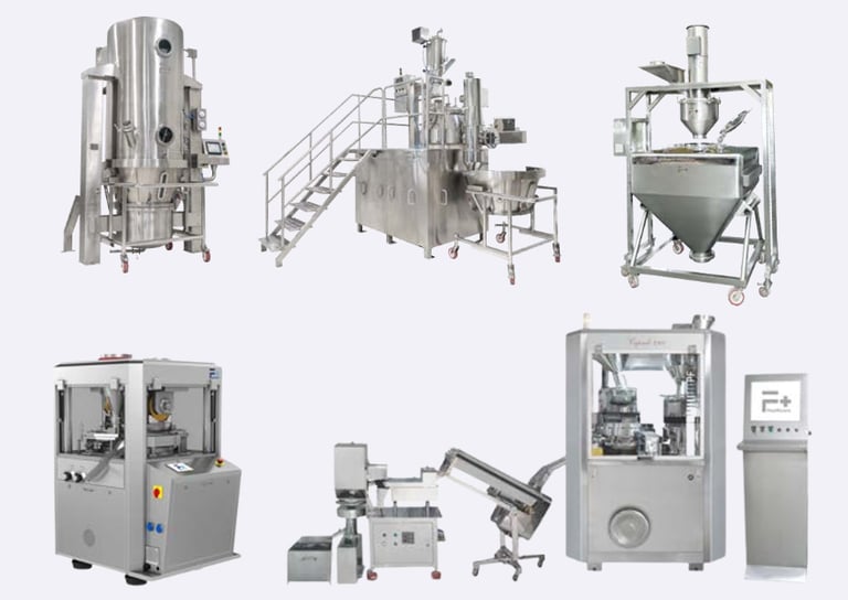 Pharmaceutical process equipment for granulation, capsule filling, tablet compression, and coating